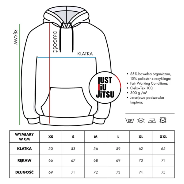 This is a mid-weight sweatshirt, ideal for wearing as an outer layer on cooler days. It is made from a high-quality cotton and polyester blend, with a soft, brushed finish on the inside (fleece-like) that provides pleasant warmth and comfort. The fabric weight is approximately 320 g/m², which is the perfect compromise between warmth and freedom of movement. The sweatshirt has a regular fit, which ensures comfort and freedom of movement for everyday wear. The sweatshirt features a double-layer hood that provides extra warmth and fits better on the head. It also has a classic kangaroo front pocket, perfect for warming your hands or storing small items. Hood adjustment cords with metal eyelets in the color of the sweatshirt. To keep your sweatshirt soft, in shape, and with vibrant colors, we recommend washing it at a low temperature (maximum 30°C) to protect both the graphics and the inner layer. Avoid tumble drying, as high temperatures can cause the fabric to shrink and pill. The best method is to dry it at room temperature. We care about comfort, which is why we use modern DTF printing technology. This means that the print is integrated into the fabric, is flexible, and barely noticeable to the touch. We avoid thick, “plastic” prints that are stiff and crack after a few washes. Our graphics move with the fabric, ensuring maximum comfort. The Just Jiu Jitsu sweatshirt and T-shirt set, with its striking typography, is recommended for Brazilian jiu-jitsu (BJJ) enthusiasts who appreciate its high quality, comfort, and thoughtful details. Just Jiu Jitsu clothing combines functionality, style, and durability, making it an indispensable part of any martial arts enthusiast's wardrobe. The BJJ TYPE 1 T-shirt is available in two colors.How warm is this sweatshirt? What is the weight of the fabric?